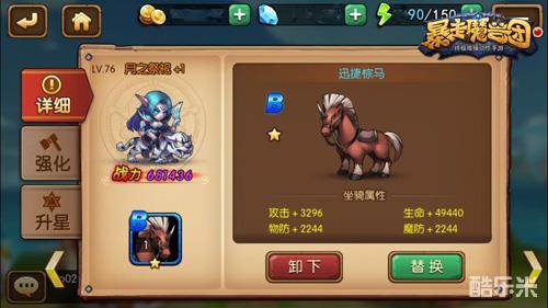 激情的战场之上,英雄们意气风发,怎么能少得了宝马良驹呢?俗话说英雄配宝马,才能尽显战场风范。《暴走魔兽团》新资料片强势推出全新坐骑系统,各种奇珍异兽等你驯服!坐骑系统将在英雄界面呈现,勇士等级只要达到55级,即可装备炫酷坐骑,为你带来攻击、生命、物防、魔防四大属性的提升。装备坐骑后,勇士可通过强化、升星等功能,进一步提升坐骑的属性,为战队提供强大战力!