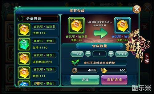 在镶嵌宝石之后,此时就可以考虑适当提升宝石的等级了,毕竟低等级的宝石带来的属性是有限的。在宝石合成页面可以看到,3个同级同类的宝石可以合成下一级宝石,合成时如果宝石不足3个是可以使用元宝代替完成合成的。宝石等级的上限最高为12级,达到12级后宝石将无法继续合成。所以宝石的合成是一个漫长的过程,参加活动、荣誉商店、元宝商店等都可以获得宝石哦。