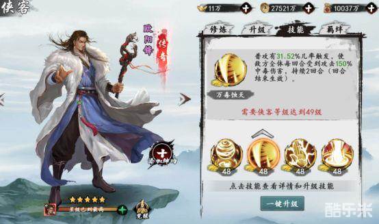 由于被动技能“万毒蚀天”的存在,因此他只需普攻就有机会令敌方群体中毒,解决了减益流侠客过度依赖主动技能(怒气)施加DEBUFF的限制。