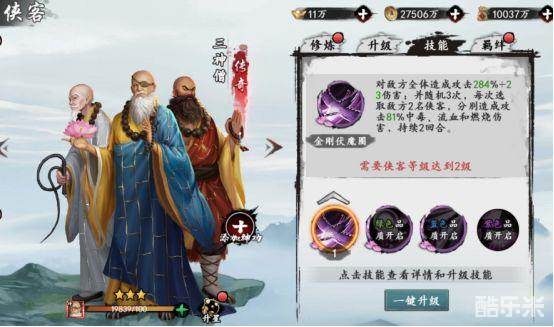 除了欧阳锋之外,三神僧的金刚伏魔圈技能,同样是一个极为给力的减益招式,能够随机二次每次给予敌方2位侠客中毒、流血与燃烧伤害。