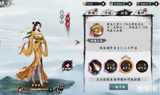 其中,黄杉女的被动技能“移魂大法”,十分适合减益流的打法,只要能复活已方前排坦克,就能为减益流阵容额外多争取几个回合数,而且还能对主力输出侠客起到保护的作用。
