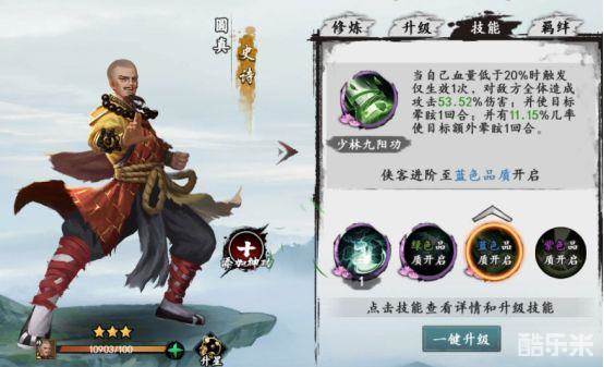 当然,由于黄杉女属于较难获得的传奇级侠客,考虑到大家侠客养成的进度,因此可以在前中期阶段,使用史诗级侠客圆真来提供全体保护功能。