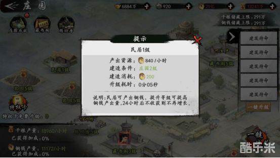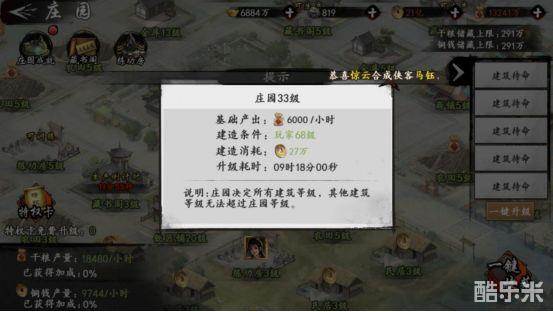 但作为功能性的基础建筑,庄园的资源产出量不是很多,但还是要着重提升庄园等级。民居和商铺可以生产大量铜币,在庄园中有着至关重要的作用,因为庄园中的所有建筑物都是依靠铜币去升级的,因此推荐大家,在均衡发展的基础上,多多提升民居和商铺等级。铜币产量随建筑等级提升而增加。