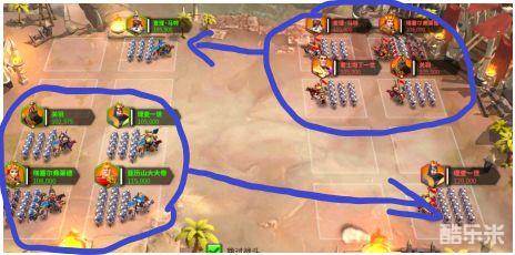 所以,在日落峡谷中,处于进攻的一方,部队永远是向上绕的,防守方永远是向下绕的。弄清楚这个概念之后,就能知道武将的范围攻击能够打到哪些目标,这样才能方便我们的排兵布阵。