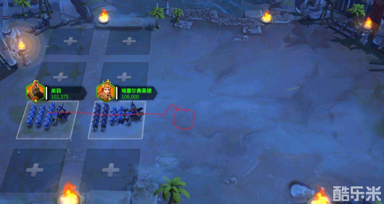 如上图所示,开始战斗后,关羽和埃塞尔就会同时直线向前,攻击圆圈这个敌人。由于埃塞尔距离较近,会先赶到成为首要攻击部队;