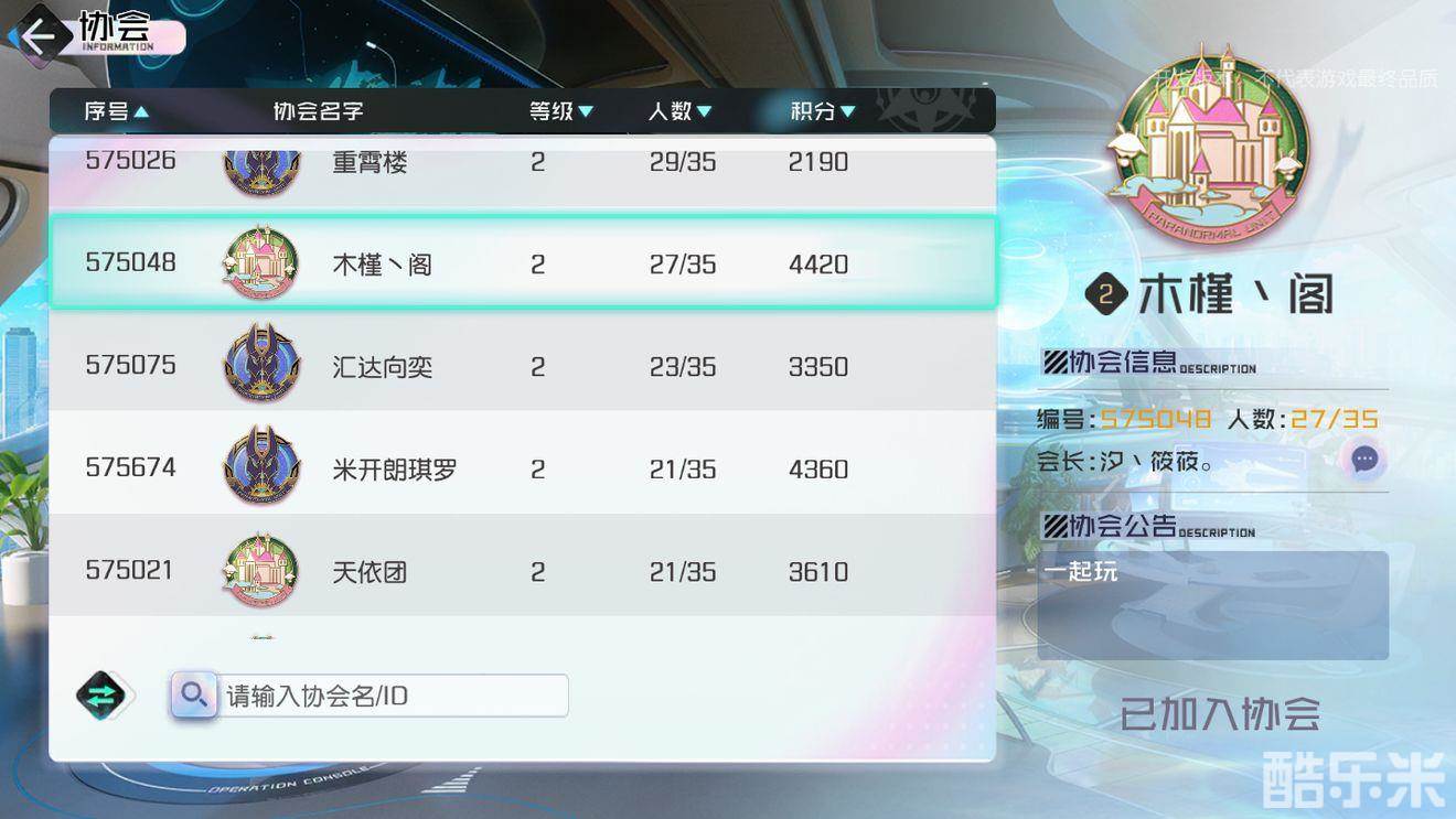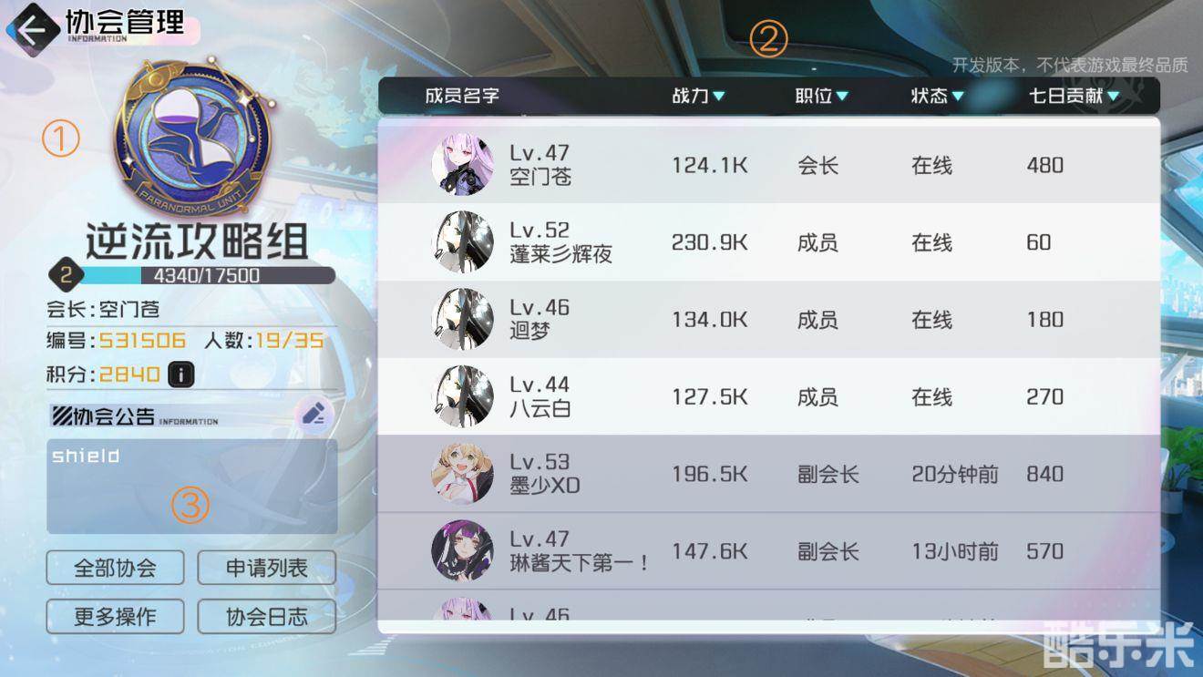 :此处显示协会的基础信息,包括头像、名称、等级、编号、人数、积分。其中,协会积分由挑战各种协会副本可得,可用来开启部分协会关卡。此外,协会会长可以在此修改协会头像,共有10种不同风格头像供选择