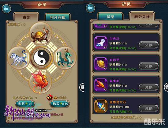 当然,想要快速突破天赋,没有材料怎么行!本次版本更新的另一大亮点就是祈灵活动啦,在激活天赋时,四象之力会消耗青龙鳞、白虎爪、凤凰羽、玄武甲等各种稀有材料。而获取这些材料的入口之一就是祈灵活动,玩家可以通过四象中的祈灵活动入口,参与活动就可以很快获得四象之力的升级材料哦!同时,祈灵还可以获得一定积分,累积积分后,还可以前往积分兑换,更有稀有圣兽进化石等着你哦。小伙伴们,赶紧动起来吧!