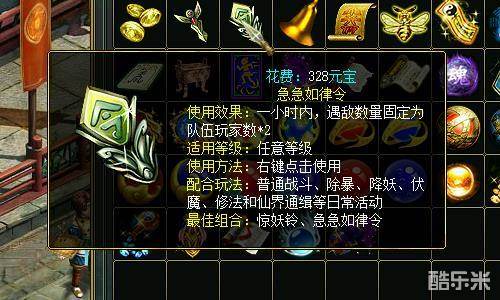 然后,我们还要说一下商城中的“急急如律令”道具。在商城中,系统给出的说法是,在战斗中,包括普通战斗、除暴、降妖、伏魔、仙界通缉和飞仙渡邪任务,玩家所遇到的怪物数量皆为满怪,持续1个小时。也就是说,在道具时间内,我们每完成一场战斗都将获得经验、道行等数值奖励的加成,还可以额外获得随机道具奖励!