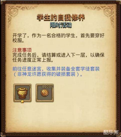 还记得那些年,初入迷宫一身学徒套装的萌新模样吗?迷宫冒险者的校服就是学徒套装!前往任意迷宫收集并穿好全套校服(学徒套装),就可以获得闪闪惹人爱的金罐。