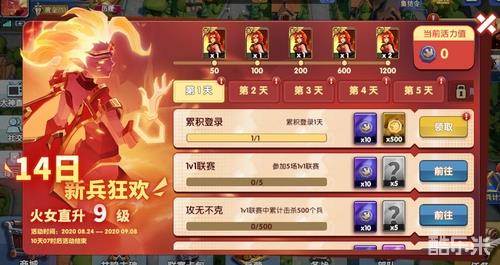 首次创建账号后,每日登录完成对应任务,即可获得金币+兵种碎片+联赛卡包钥匙的奖励,更可额外火女英雄碎片。连续完成14日任务,可获得总计金币*28500+各等级兵种碎片240个+13把钥匙的奖励,英雄火女更可直升9级。