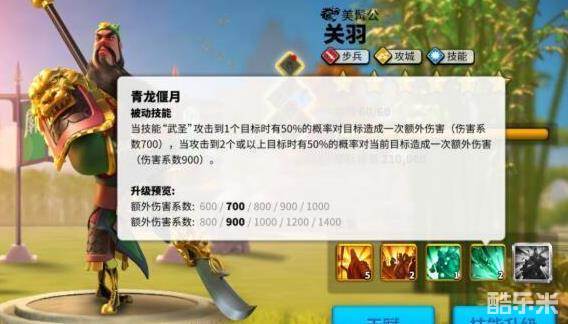 一技能是关羽的核心技能,范围沉默也是游戏独有的,然后来看伤害系数2000,一个步兵真的很高很爆炸了,目前传说统帅达到2000及以上的只有三个,关羽爱德华(2500)李舜臣(2000),而且关羽一技能副将效果和爱德华一样伤害减半,所以他尽量只做主将,不要副将浪费伤害。然后这个沉默也很恶心啊!还是伴随着伤害aoe性质的,很容易造成对面怒气溢出脑溢血!哈哈。