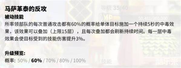 技能4【马萨革泰的反攻】:每次普攻有60%的概率叠加一层中毒(5秒),上限15层,每层中毒提高技能伤害3%。