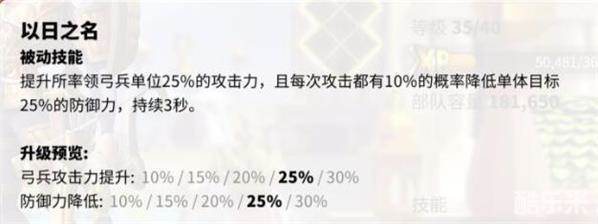 技能3【以日之名】:弓兵攻+30%;普通攻击有10%概率减防30%(3秒)。