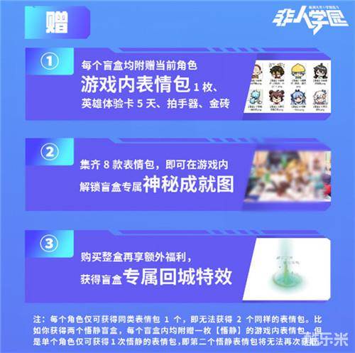 除了精美的角色手办,每个盲盒还将附赠当前角色游戏内表情包1枚、英雄体验卡5天、拍手器和金砖。集齐8款表情包,还能在游戏内解锁盲盒专属“神秘成就图”喔。假如选择整合购买,则还能额外获得“盲盒专属回城特效”。多重福利满满,你还在等什么呢?