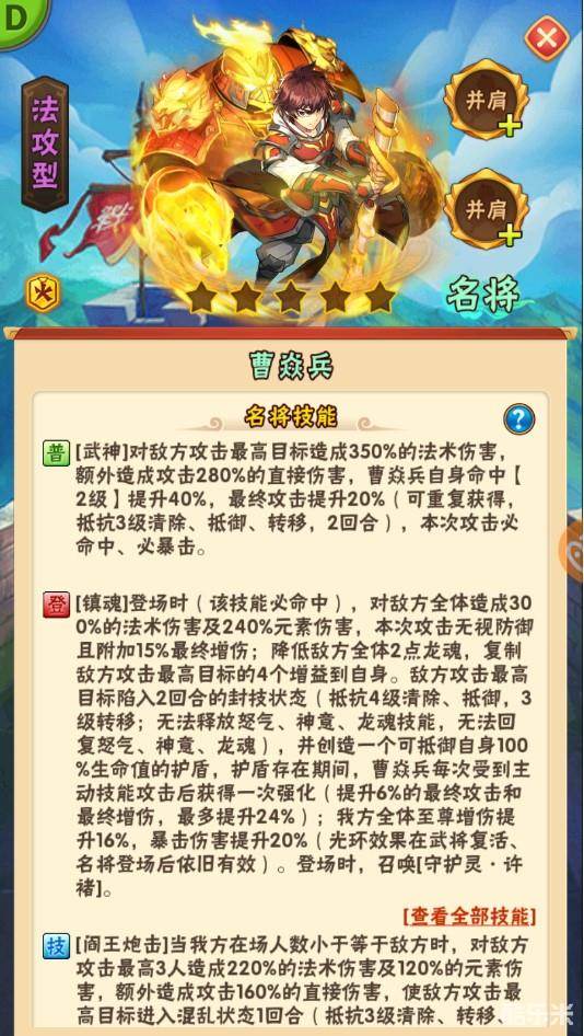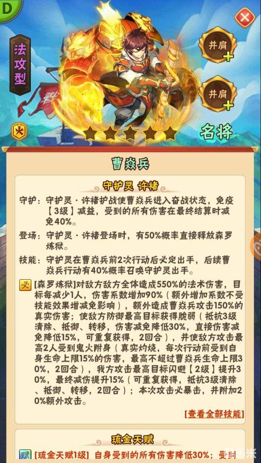 守护灵登场将令曹焱兵进入奋战状态,在承受伤害上获得相应的减益效果。同时,守护灵自带的必杀技能可使敌方“引火上身”,敌方全体在承受巨额伤害的同时,原本的伤害减益BUFF将被削弱。