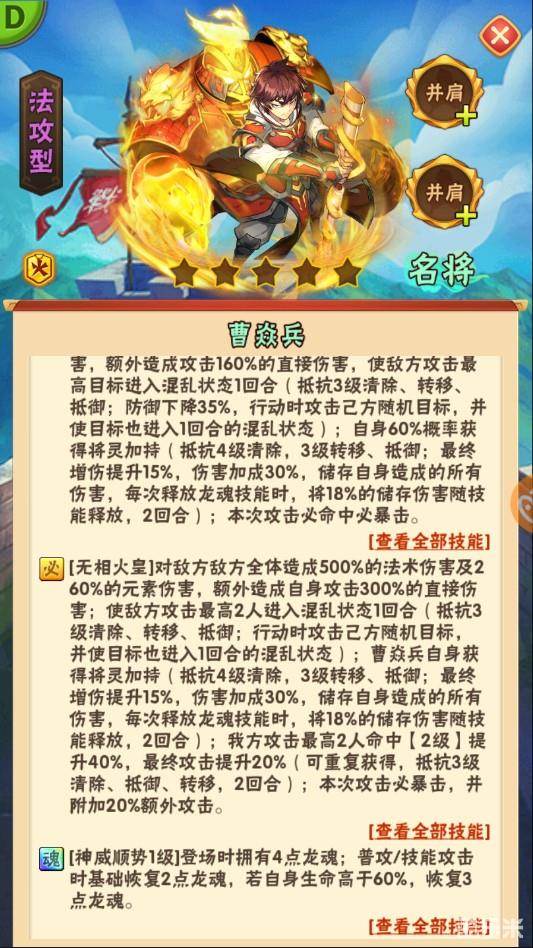曹焱兵拥有强力的登场大招“镇魂”,该技能可导致敌方全体武将承受巨大的法术与元素伤害,降低对方全体龙魂。登场即群控,瞬间改变战场局势。同时,该技能可大幅提升我方全体伤害,为自身创造一个强大护盾,每次承受主动技能攻击后护盾都将得到强化。此消彼长,帮助少年迅速获取优势。