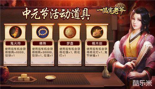接下来让小编为官人介绍一下,《一品官老爷》中元节活动攻略吧!《一品官老爷》准备了非常多丰富的道具,包含鬼火符、佛珠、罗盘、桃木剑等驱妖除魔的必备道具,使用后有机会获得银两、饺饼、花馍、荷花灯、鬼节钟馗等物品。