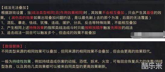 战法不同类型但效果相同时,可以叠加。举例:黄月英的战法匠心不竭和李儒的战法逆反毒杀,同有恐慌效果,但一个为指挥战法,一个为主动战法,其恐慌效果可以叠加。