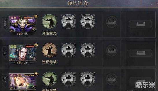 在战法搭配选择上,灵帝作为主要输出,可以搭配连战+温酒/道行+兼弱;保证伤害最大化,李儒作为辅助输出,可以搭配落雷/迷阵+水淹七军/焰焚箕轸这种一控制一输出的战法,保证队伍技能控制敌方,又能进一步加强输出;太后作为团队续航者,可以搭配青囊秘要/规避/步步为营/+战必断金/伐谋/反计之策等,在保证自身生存的同时,也加强了团队的生存能力。