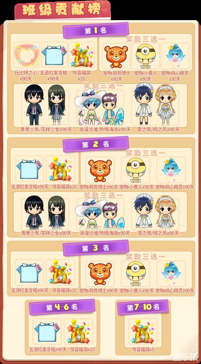 活动结束后,在各自班级中,积分增长最多的前十名玩家可获得“班级贡献榜”中的对应奖励: