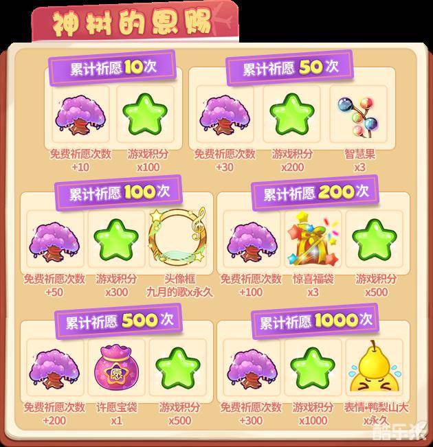 活动期间,前往“祈愿神树”购买绿芽,赢取丰厚奖励吧!根据你累积祈愿的次数,获得额外奖励:
