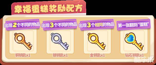 活动期间,在一块隐藏的4x4方格中藏有“西瓜”、“草莓”、“菠萝”和“蛋糕”!每种水果有5份,而蛋糕只有1份!每次花费3000游戏币可参与制作“幸福蛋糕”,从方块中翻开任意三块,并根据所出现的物品获得对应奖励: