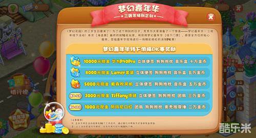 《梦幻花园》三周年特别企划——嘉年华线上海选赛启动!9月4日-9月13日,参与线上海选,赢海量金币、道具、周边奖励!在线上海选中位于排行榜前列的小伙伴,还将有机会获得梦幻嘉年华“线下门票”。持有“线下门票”的小伙伴将前往线下参与梦幻嘉年华狂欢盛典,万元现金和更多惊喜等着你!