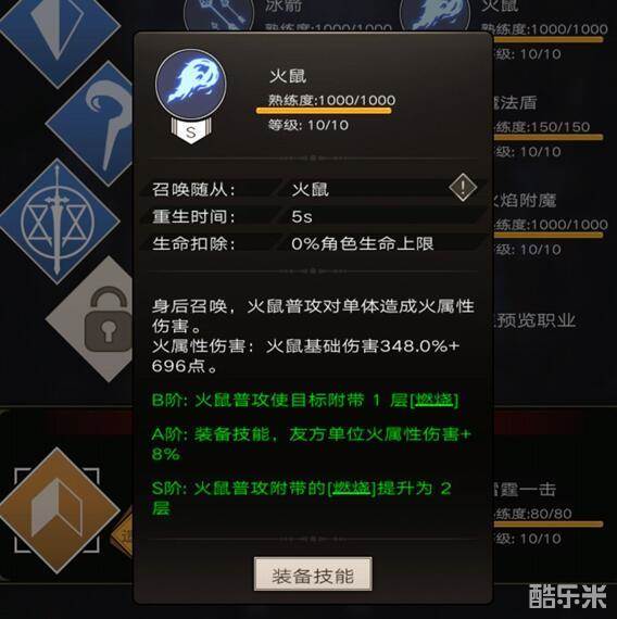 召唤随从方面可以选择火鼠,配合魔剑士的火焰附魔,火鼠应该是游戏最适合魔剑士使用的随从了,不过火鼠技能是一转职业魔术师的技能,所以玩家们之后如果想要玩魔剑士的话,在一转的时候就需要要选择魔术师了