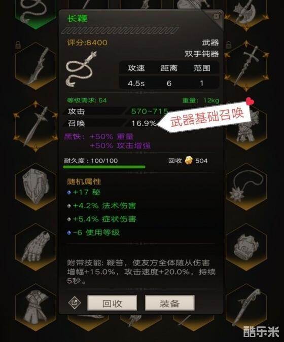 长鞭的效果能够提神全体随从的伤害以及攻击速度,基本是前期召唤流的标配装备了。