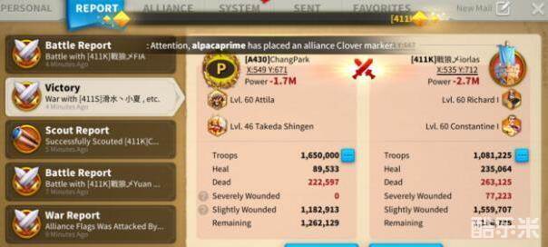 这里分享一个阿提拉/武田战报,打理查+君士坦丁这种经典防守组合,战损比高达1:1.6,可以说是非常惊人了。这是在KVK当中的战报,因为KVK地图BUFF的关系,阿提拉选择了一身攻击属性加成的装备,使得普攻和反击伤害的最大化,这样可以打出最高的战损比,让防守方非常头疼。