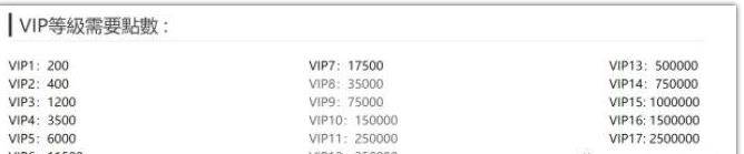 首先呢,要给大家科普一下各个VIP等级所需的VIP点数(如图)