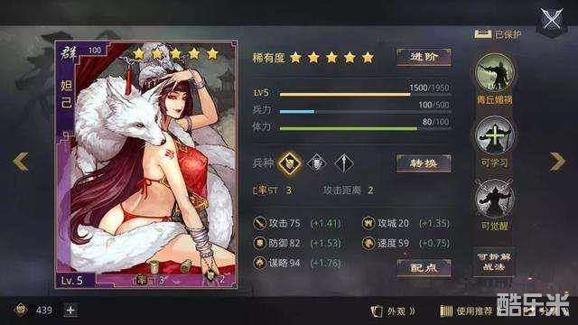 中军武将妲己,全谋略加点,战法【重整旗鼓】【三军之众】,妲己的谋略成长不低,带恢复战法提高续航能力。