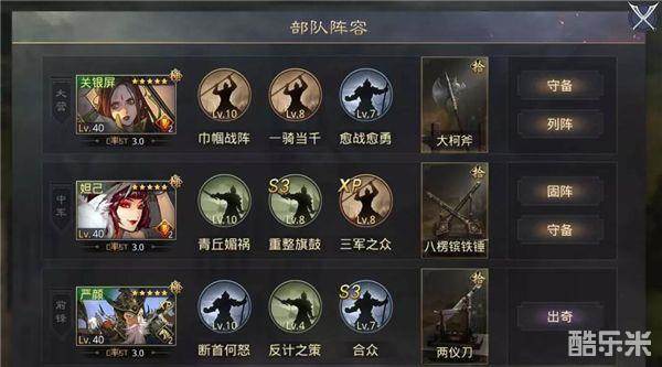 大营武将关银屏,全攻击加点,战法【一骑当千】【愈战愈勇】,队伍的核心输出,给不了击势给愈战也是可以的。