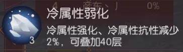 冷属性弱化:冷属性强化、冷属性抗性减少2%,最多叠加40层,合计减少80%。