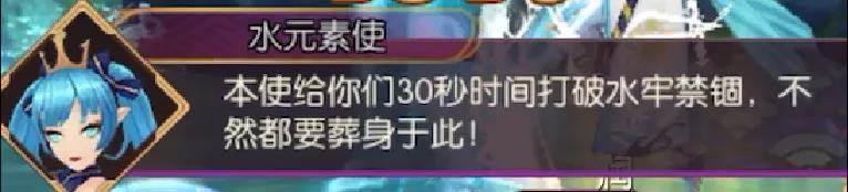 机制介绍:水元素使召唤水监牢,击飞玩家,同时将玩家锁定在水牢之中,在水牢中玩家不可暴怒,且必须在一定的时间(30s)内打破水牢否则秒杀,类似于天草四郎阶段。打破水牢有一定的输出时间。