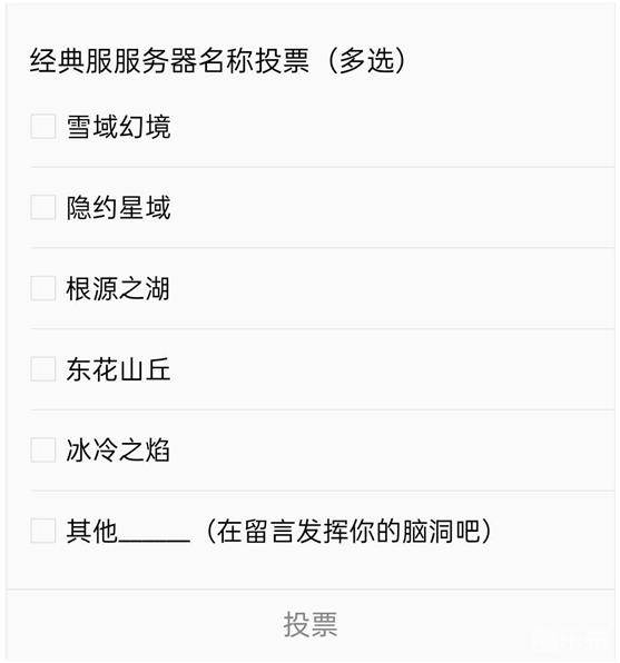 此前开放预下载显示,经典服三大新服的名称分别为“雪域幻境”、“隐约星城”、“根源之湖”。但官方考虑到玩家的喜好,开启经典服服务器名称投票,所有玩家均可以在此前的三个名称外加“东花山丘”、“冰冷之焰”中进行投票,同时也可以发挥自己的创意自创一些好听、有故事的名称进行留言,官方将会根据投票据俄国确定最终的服务器名称。