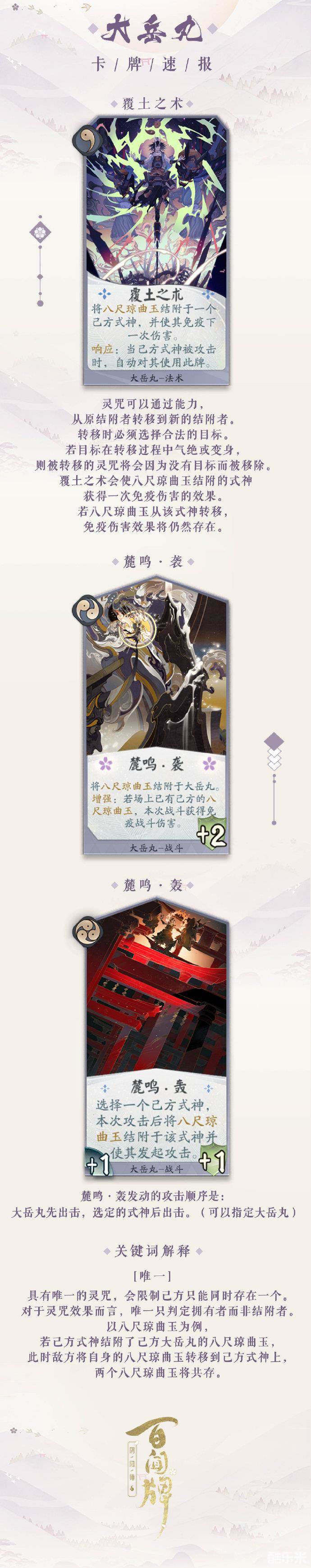 战斗牌“麓鸣·袭”则直接把灵咒结附于大岳丸自身。当场上已有己方的“八尺琼曲玉”,则大岳丸免疫此次战斗伤害。另一张战斗牌“麓鸣·轰”同样可以结付给一名己方式神灵咒效果,使其在大岳丸出击之后,再接着发起一次攻击——这位式神可以选定大岳丸。需要注意的是,灵咒的效果具有唯一性,其效果只在灵咒的拥有者而非结附者身上产生。若己方式神已结附了“八尺琼曲玉”效果,当敌方将该灵咒转移到己方式神上,则两个八尺琼曲玉共存。