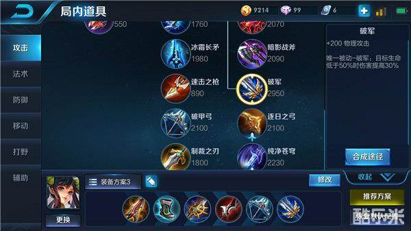 破军提供物理攻击的加成,并且当目标生命值低于一定的百分比时可以增加对目标的伤害,对付残血英雄非常的有用,大大提高自己的输出能力,使伤害达到最大化。