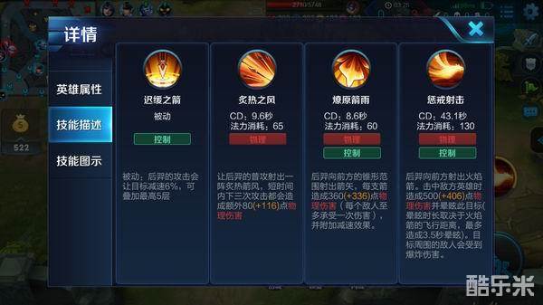 炙热之风(一技能):此技能是后羿的主要输出技能,后羿开启技能后,其普攻会射出一沉炙热的箭风,短时间内会造成额外的伤害。此技能使后羿的攻击提升,配合普攻能打出高额伤害,在短时间内极大的提高后羿的爆发能力,特别是在减速敌人后,在线上,凭借其短时间爆发来压制敌人的发育。