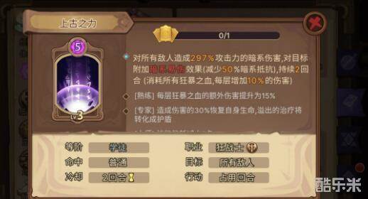 废话不多,狂战就只要一个技能,如图2,能打能回复,英雄必须 SS,SS抽到是入门硬属性,然后看图1历练第一个技能是什么,不是陷阱减免什么的差不多就可以用了,基础技能最好是上古之力,不是的话第二个技能带上就好了,然后剩下的历练怎么肉怎么来,大家随意