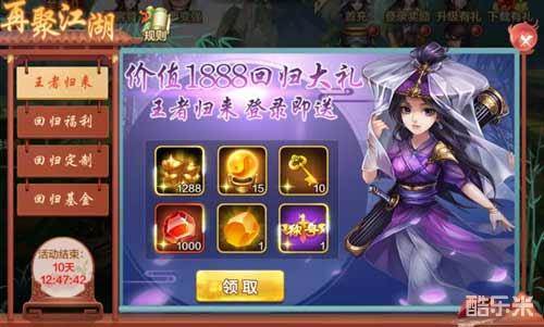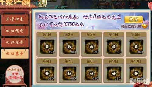 重新聚首江湖路途遥远,基金助你无所畏惧。再聚江湖活动开启后,大侠可以98元购买回归基金,每天领取980元宝连续10天,累计可得10780元宝!