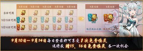 想在周年庆期间召唤更多妖灵的降妖师,也可参与7日登录免费十五抽活动,今日维护后至9月14日,每日登录均可为当日赢得一次免费唤灵机会,并为9月15和16日各带来免费唤灵机会一次,总计十五次免费唤灵机会,助你招募心仪妖灵!