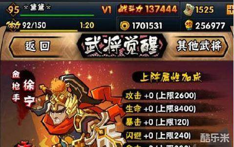 武将觉醒可提高的属性有攻击、生命、暴击、闪避、命中和爆抗,而且每个武将每个属性上限都是不同的。觉醒属性上限跟武将的职业相关,正如他们职业一样,战将是攻击的属性更高,坦克是生命更高。属性上限还跟武将等级、转生有关,等级和转生越高上限越高。