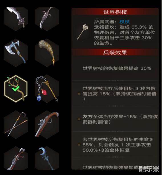 世界树枝是一个实用性非常广泛的兵装,只要的作用就是给我们提供了充足的恢复能力,在我们把世界树枝升到两星之后还能够使全体的治疗效果增加15%,装备了世界树枝之后战斗的时间也会被大大延长。