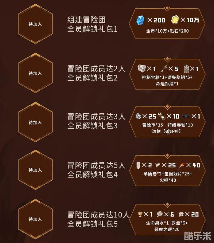 冒险团成员达到3人:冒险币*25,特级卷轴*10,定制纪念幻化边框【破坏神】*1。