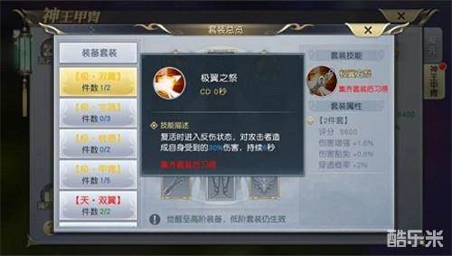 通过激活、升阶神王甲胄,可提升神王甲胄的品质,品质分为蓝、紫、橙、红、金,可获得大量属性,除此之外,将指定神王甲胄提升至指定阶数可激活套装效果,激活红色、金色套装还可解锁强力技能。