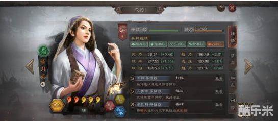 属性方面,黄月英有着不错的速度和智力,同时拥有合格的统率,但是其武力十分的低。属性方面中规中举,不过因为兵种适应的原因,所以战场上黄月英的属性通常都低于合格线,这也导致了它在一般情况下需要搭配一些不吃属性加成的战法。