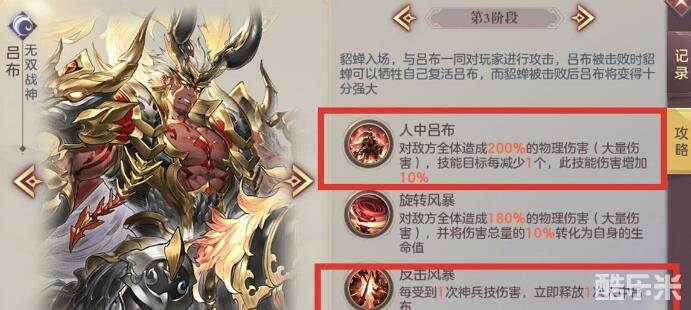 打吕布的关键在于第三阶段的时候不能使用神兵技能,因为在吕布的第三阶段有两个很重要的联动的技能使用,分别是反击风暴和人中吕布。
