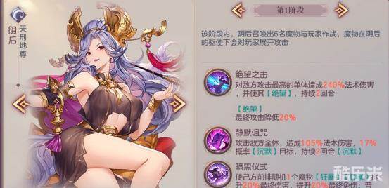阴后的第一阶段有六个不同的技能,一些是单体攻击的技能,玩家有肉盾型的防御武将即可处理,值得注意的是阴后会每隔三个回合就会召唤魔物,玩家想要将自己的伤害灌到阴后身上的话,需要先将小怪给优先处理掉,玩家需要在前四个个回合内使用群体技能的大招的角色先将小怪清理掉。