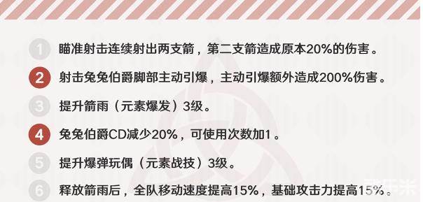 箭雨(Q):主要输出手段,能量消耗:40,低。队伍中没有其他火元素角色时能量积攒慢,触发超载反应时很容易散怪,且由于是短时快速连续攻击,因此无法多次迟到蒸发、融化反应加成。